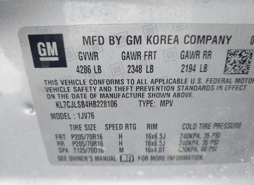 - VIN: KL7CJLSB4HB228106