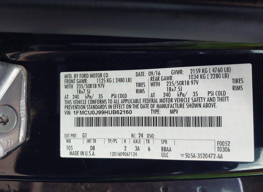 - VIN: 1FMCU0J99HUB62160
