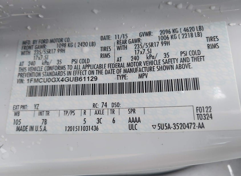 - VIN: 1FMCU0GX4GUB61129