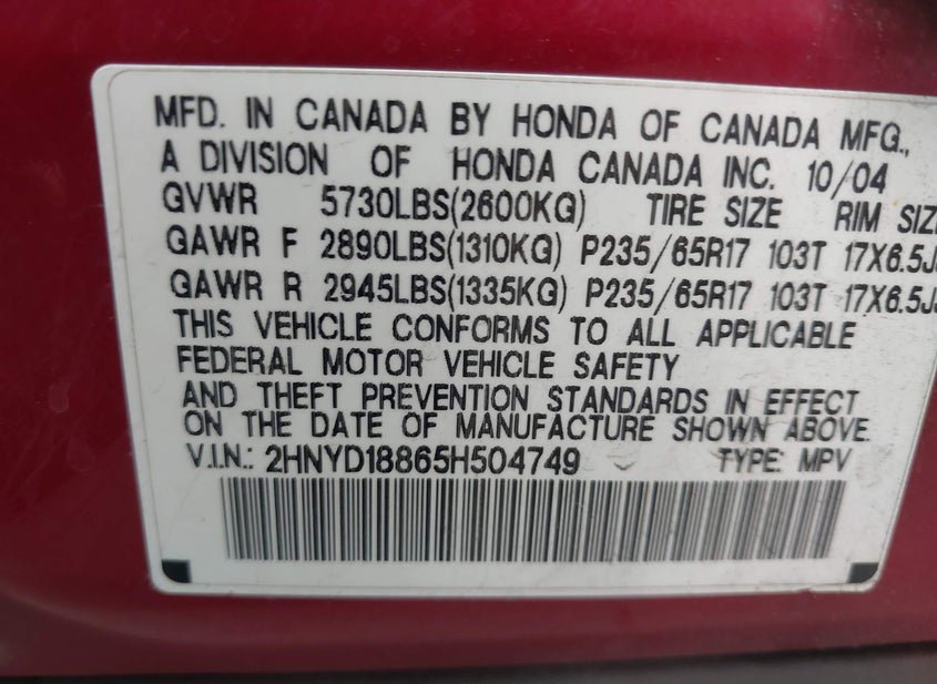 - VIN: 2HNYD18865H504749