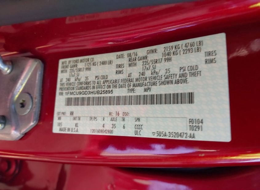 - VIN: 1FMCU9GD3HUB25895