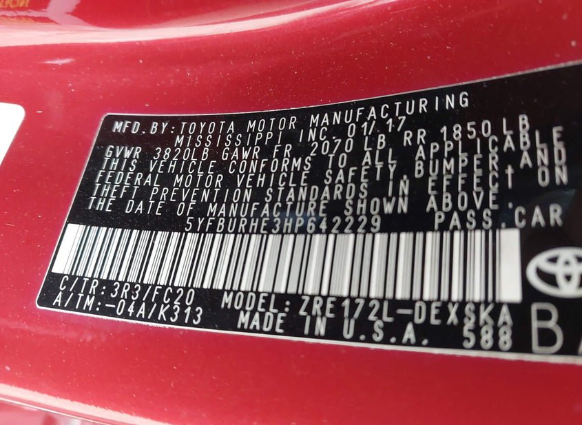 - VIN: 5YFBURHE3HP642229