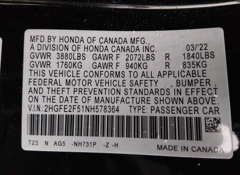- VIN: 2HGFE2F51NH578364