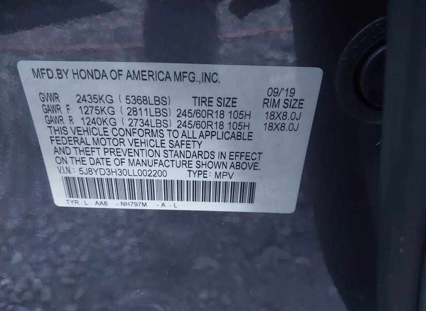 - VIN: 5J8YD3H30LL002200