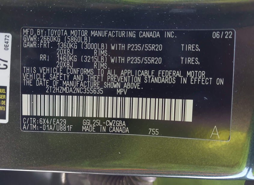 - VIN: 2T2HZMDA2NC355635