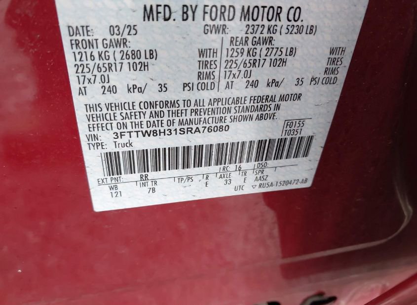 - VIN: 3FTTW8H31SRA76080