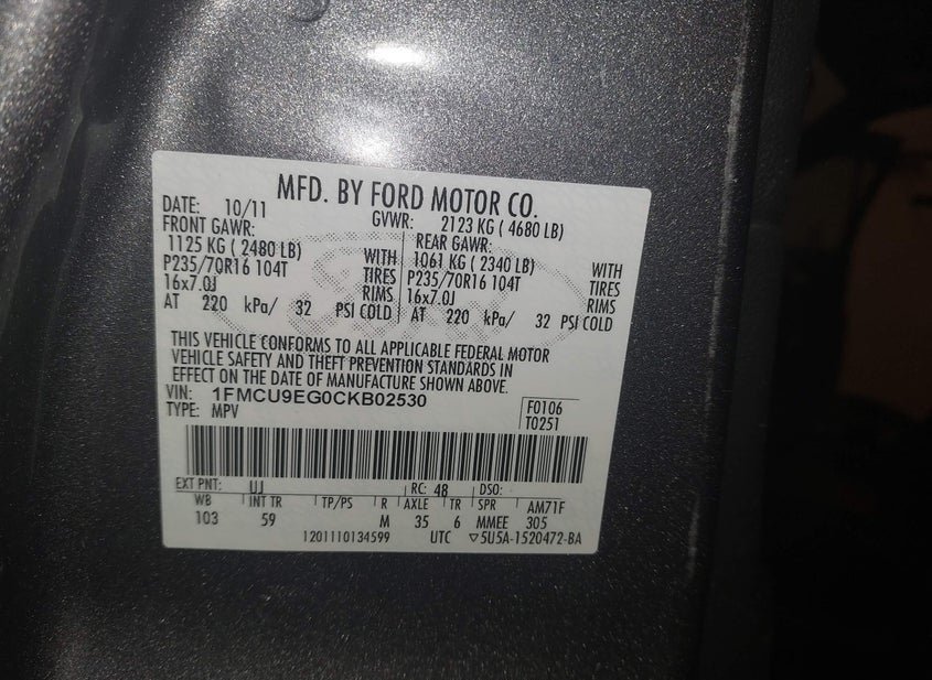 - VIN: 1FMCU9EG0CKB02530