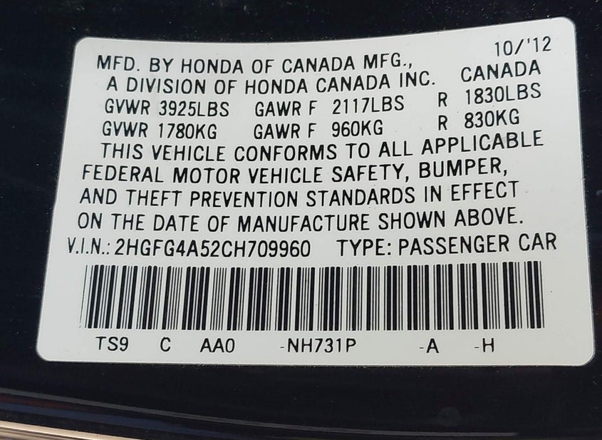 - VIN: 2HGFG4A52CH709960