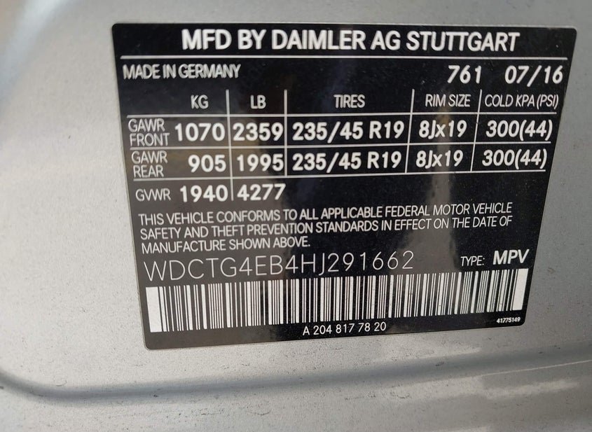 - VIN: WDCTG4EB4HJ291662