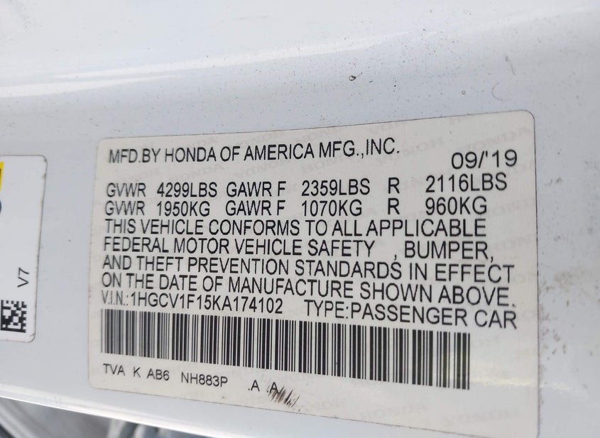 - VIN: 1HGCV1F15KA174102