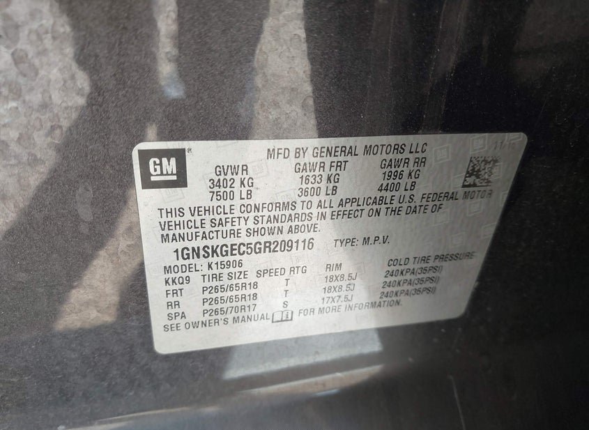 - VIN: 1GNSKGEC5GR209116