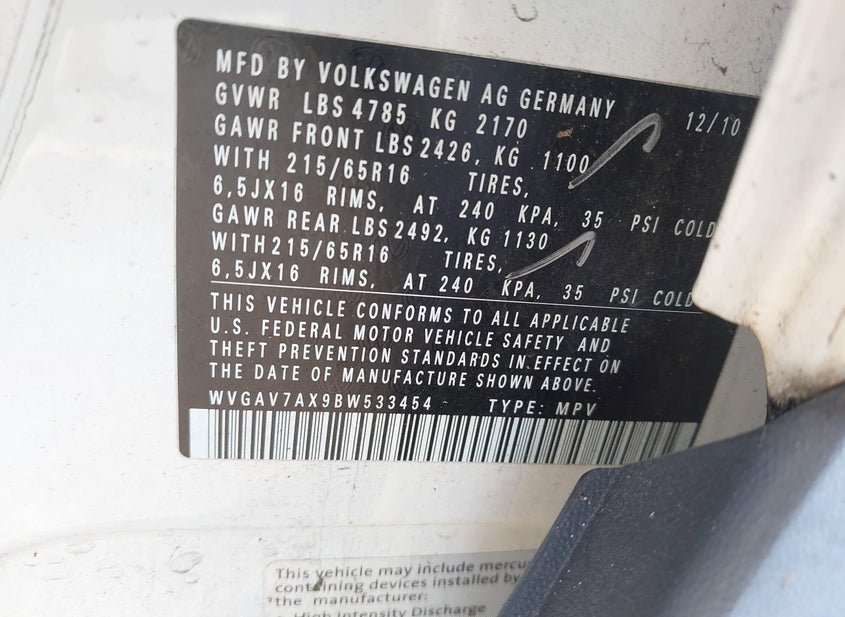 - VIN: WVGAV7AX9BW533454