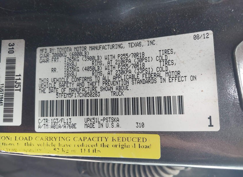 - VIN: 5TFEM5F17CX050283