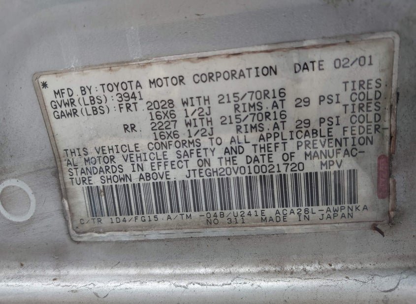 - VIN: JTEGH20V010021720