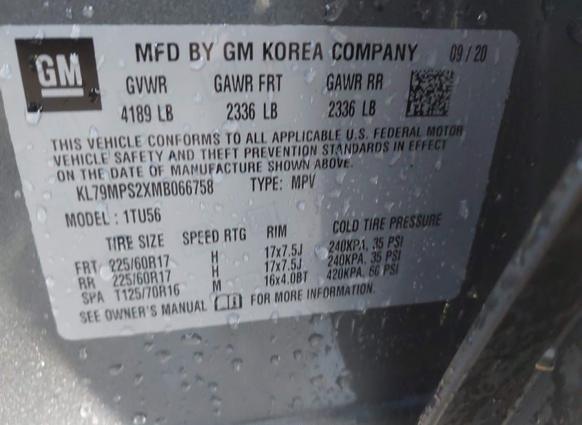 - VIN: KL79MPS2XMB066758