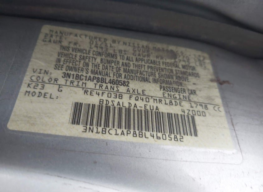 - VIN: 3N1BC1AP8BL460582