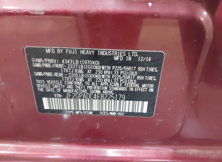 - VIN: JF2GPADC4F8225179