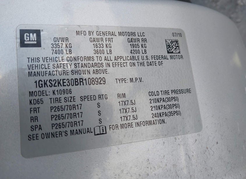 - VIN: 1GKS2KE30BR108929