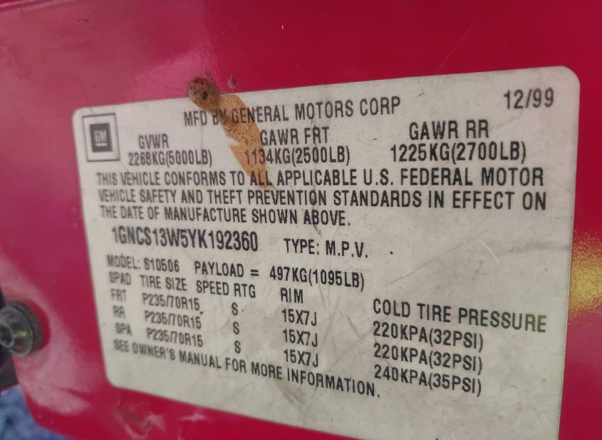 - VIN: 1GNCS13W5YK192360