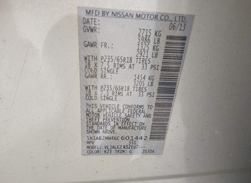 - VIN: 5N1AR2MN4EC601442