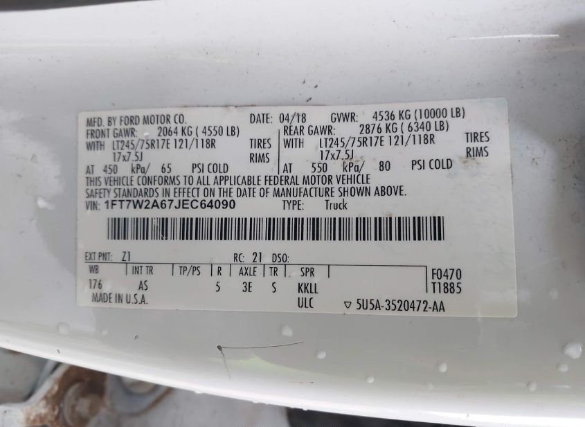 - VIN: 1FT7W2A67JEC64090