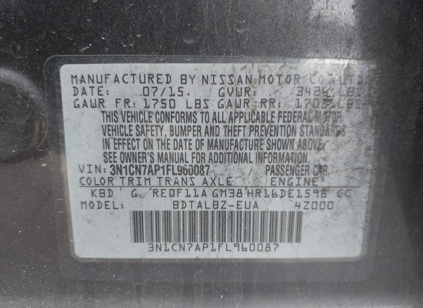 - VIN: 3N1CN7AP1FL960087