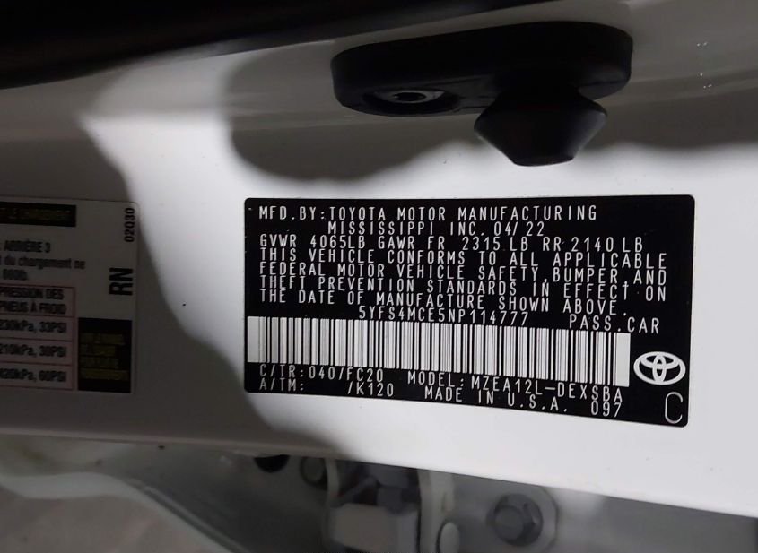 - VIN: 5YFS4MCE5NP114777
