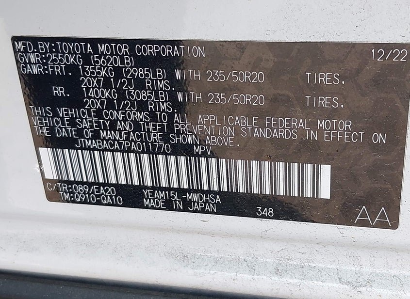 - VIN: JTMABACA7PA011770