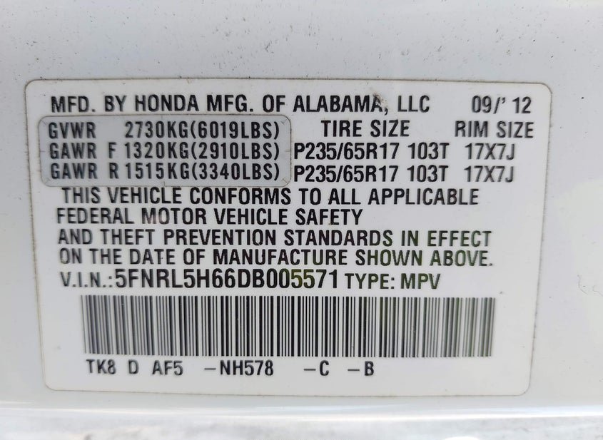 - VIN: 5FNRL5H66DB005571