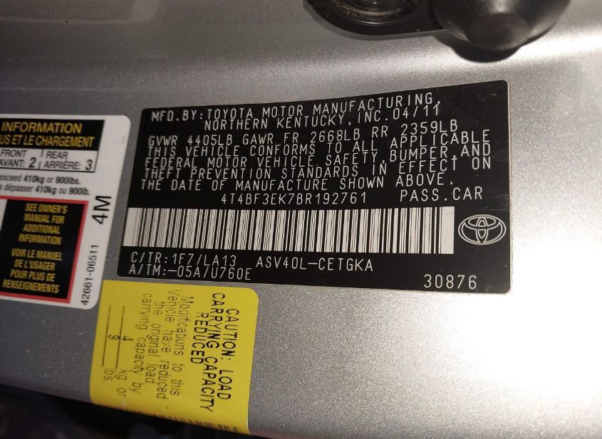 - VIN: 4T4BF3EK7BR192761