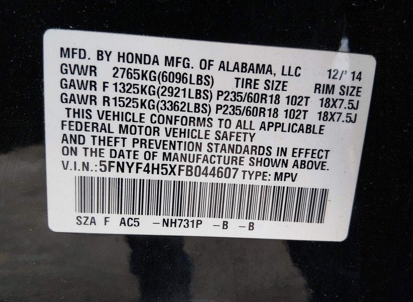 - VIN: 5FNYF4H5XFB044607