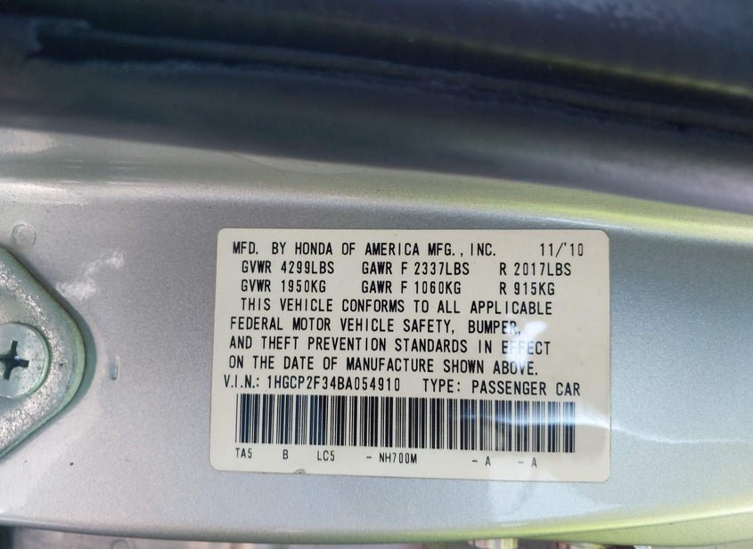- VIN: 1HGCP2F34BA054910