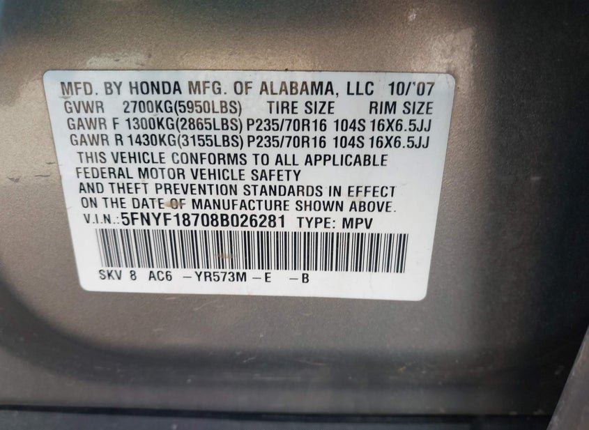 - VIN: 5FNYF18708B026281