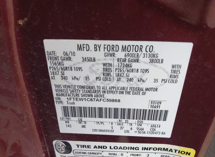 - VIN: 1FTEW1C87AFC59868