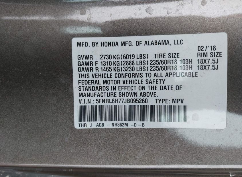 - VIN: 5FNRL6H77JB095260