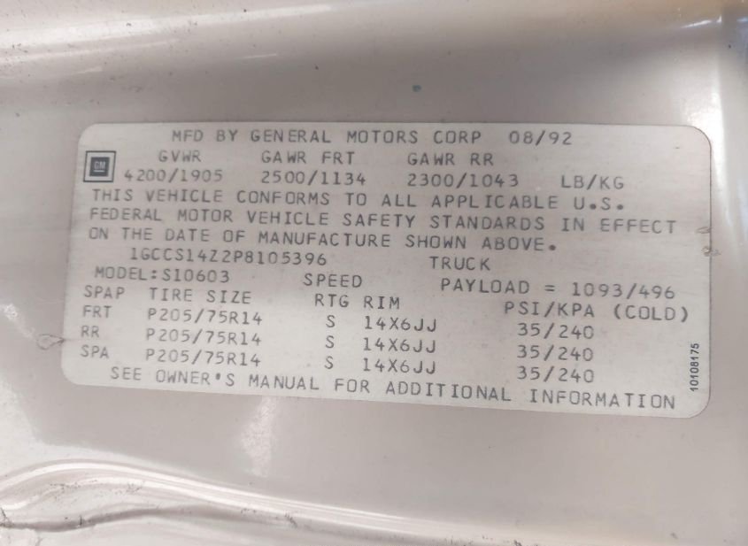 - VIN: 1GCCS14Z2P8105396