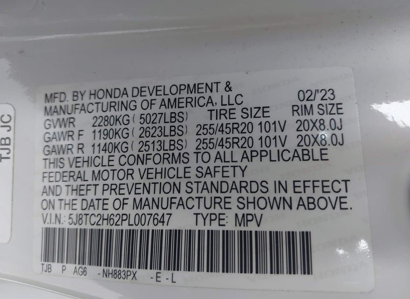 - VIN: 5J8TC2H62PL007647