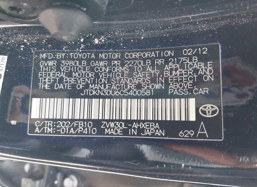 - VIN: JTDKN3DU6C5400581