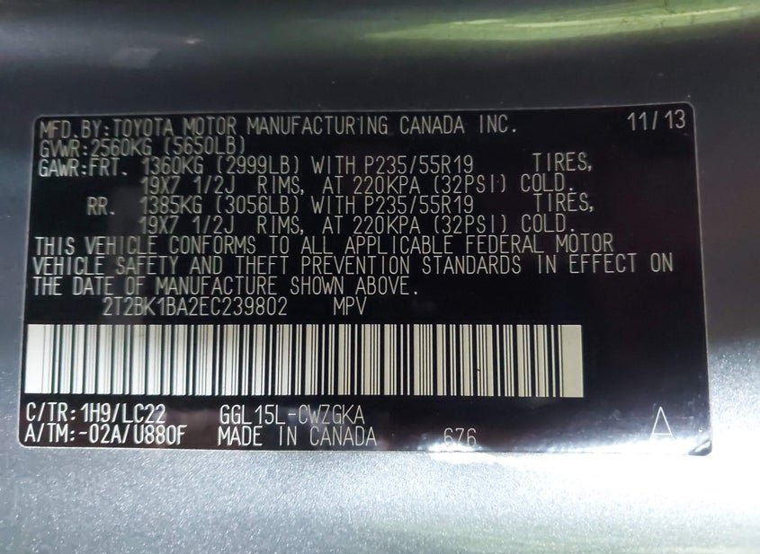 - VIN: 2T2BK1BA2EC239802