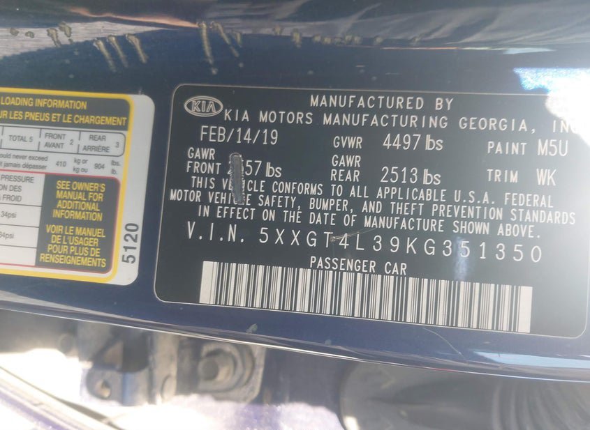 - VIN: 5XXGT4L39KG351350
