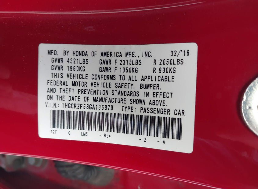 - VIN: 1HGCR2F58GA136979