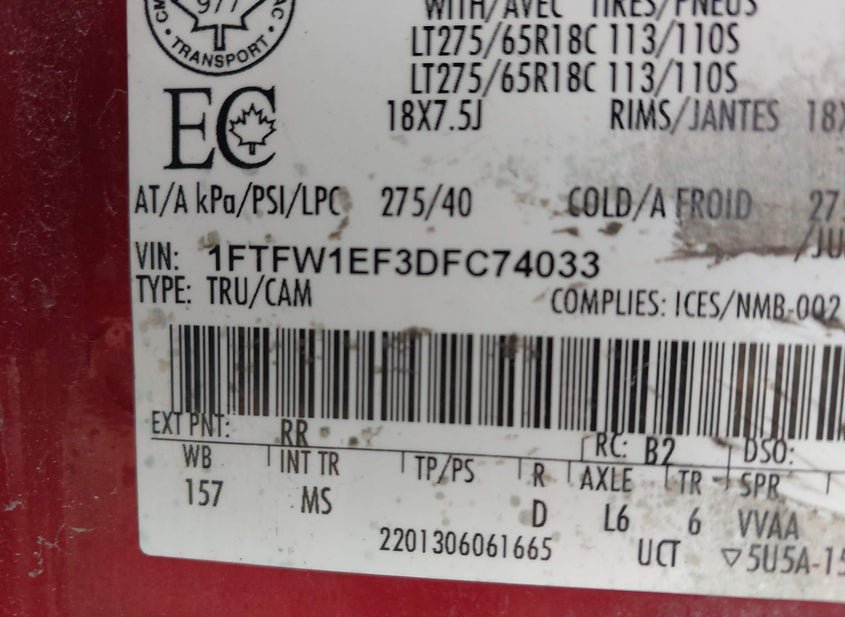 - VIN: 1FTFW1EF3DFC74033