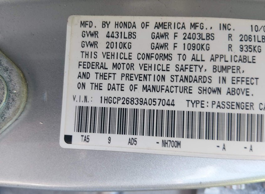 - VIN: 1HGCP26839A057044