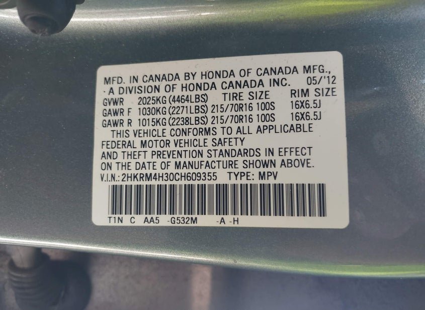 - VIN: 2HKRM4H30CH609355