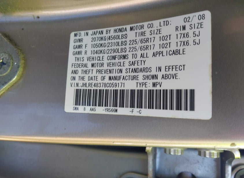 - VIN: JHLRE48378C059171