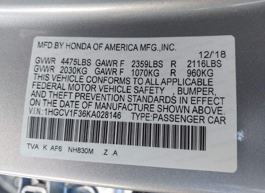 - VIN: 1HGCV1F36KA028146