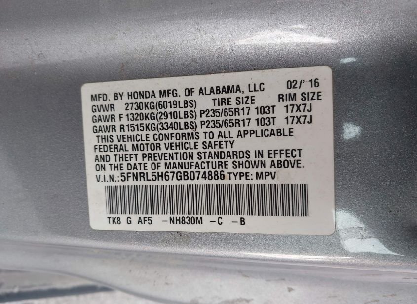 - VIN: 5FNRL5H67GB074886