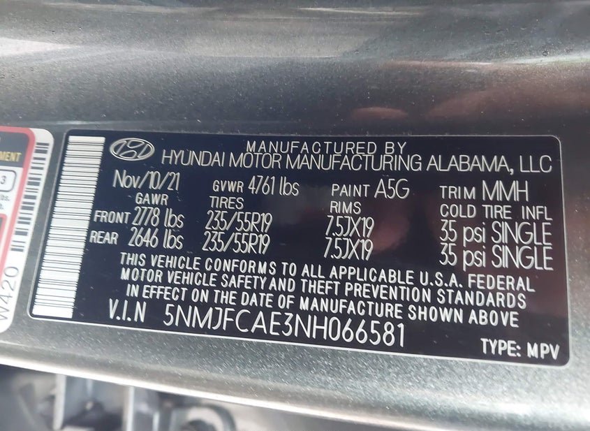 - VIN: 5NMJFCAE3NH066581