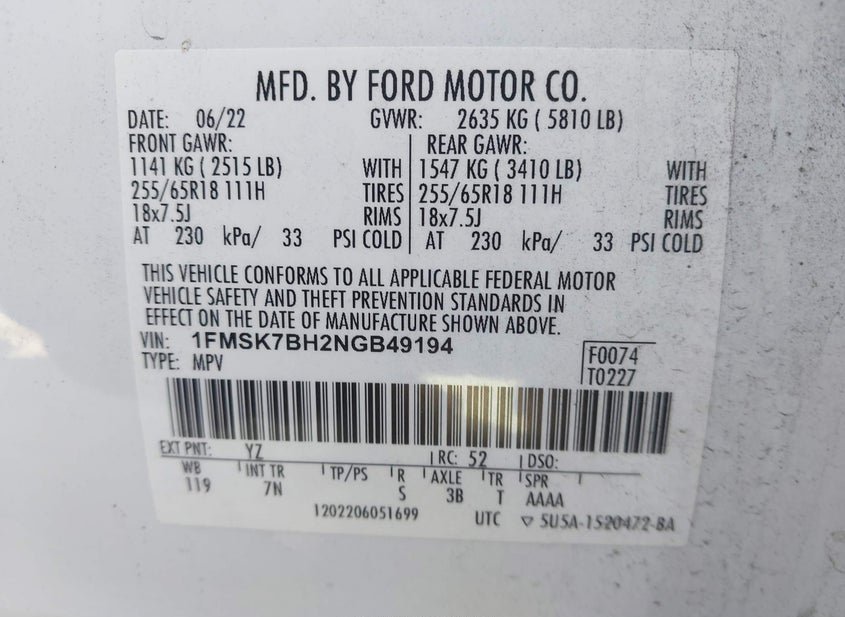 - VIN: 1FMSK7BH2NGB49194