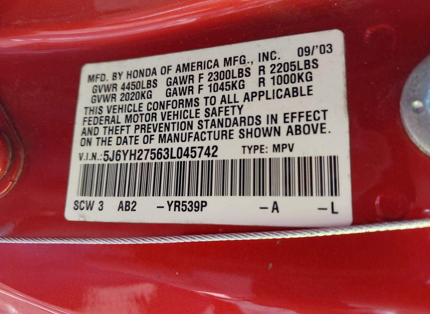 - VIN: 5J6YH27563L045742